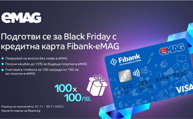 Всеки клиент на Първа инвестиционна банка, заявил и активирал кредитна карта Visa Fibank-eMAG в периода 01.11.2025 г. – 30.11.2025 г. и реализирал плащане с нея в сайта https://www.emag.bg/ до 30 ноември 2025 г., има възможност да спечели една от 100 награди, всяка от тях в размер на 100 лв. Наградите са под формата на лоялни точки (всяка точка = 1 лев) в профилите на клиентите в eMAG. Печелившите ще бъдат изтеглени през декември 2025 г.