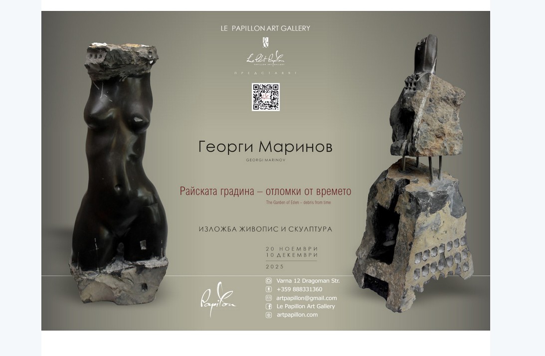 Арт галерия Le Papillon има удоволствието да посрещне скулптурите и живописта на Георги Маринов в първата му самостоятелна изложба в пространството на Art Gallery Le Petit Papillon от 20-ти ноември до 10-ти декември 2025. Темата „Райската градина – отломки от времето“ Георги разгръща в 8 пластики от гранит, черен мрамор и 12 картини, изпълнени в древната техника енкаустика. Дъските, върху които е живописвал с восък и пигменти, разказват неговия символистичен прочит за любознателността, която отвежда Адам и Ева извън пределите на Рая, за съмненията, изкушенията, като аналогия на човешките взаимоотношения в днешни дни. „Във всички времена има константи, които винаги са в основата, върху която се гради нашето битие. Осъзнати и неосъзнати.”, споделя Георги Маринов.