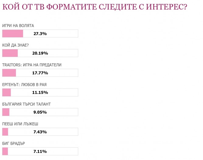 Читателите на LifeOnline.bg попълнили Анкетата на изданието с въпроса „КОЙ ОТ ТВ ФОРМАТИТЕ СЛЕДИТЕ С ИНТЕРЕС?“ , са отговорили, че се интересуват преди всичко от „Игри на воля“, друго предаване на NOVA.
