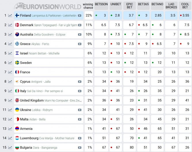 Според прогнозите на букмейкърите най-голям шанс за победител има Финландия с 22%.