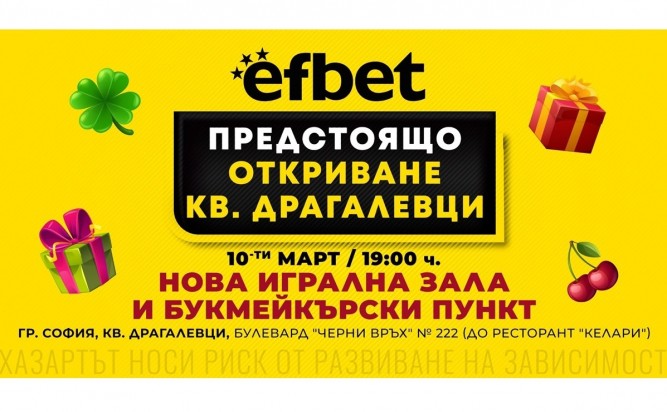 На 10 март от 19:00 ч. efbet ще открие своята юбилейна 60-а игрална зала в столицата. Локацията в района на Драгалевци (до ресторант „Келари“) е част от стратегията на компанията за разширяване на присъствието ѝ в страната и внедряване на модерни технологични решения в развлекателния сектор.