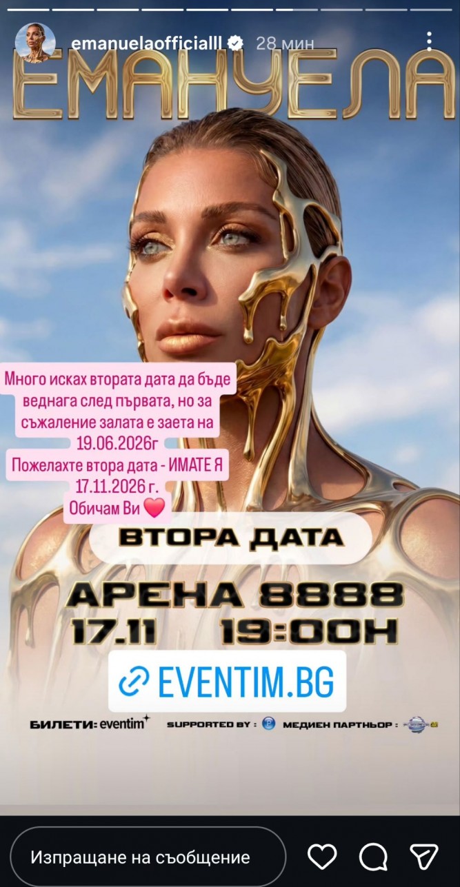 „Много исках втората дата да бъде веднага след първата, но за съжаление залата е заета на 19.06.2026 г. Пожелахте втора дата – ИМАТЕ Я! Обичам Ви!“, сподели развълнуваната певица в социалните си мрежи.