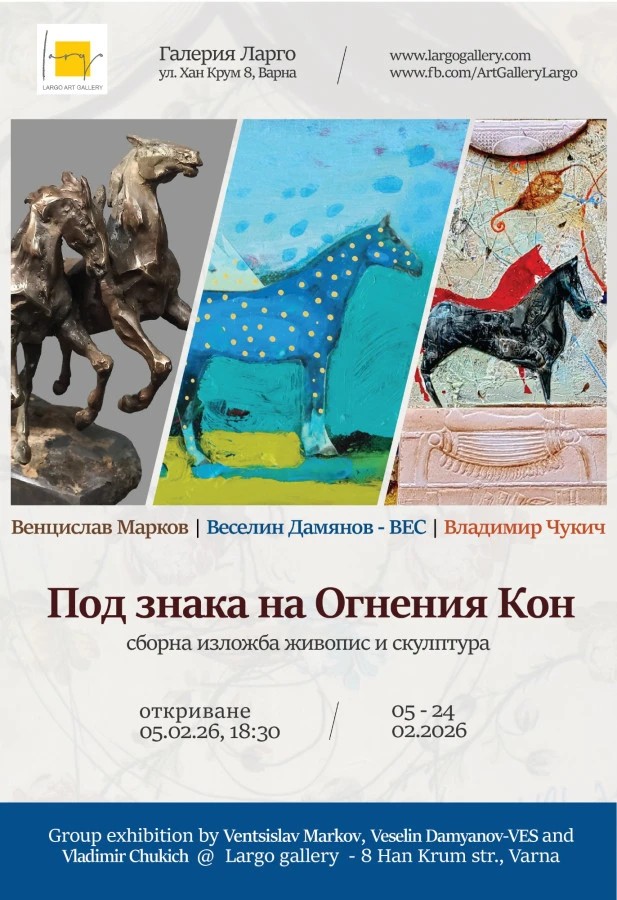 На 5 февруари 2026 година от 18:30 часа галерия „Ларго“ ви кани на откриването на сборната изложба „Под знака на Огнения Кон”, представяща творби на Владимир Чукич, Веселин Дамянов-Вес и Венцислав Марков. Трима автори с различен художествен език, изразни средства и чувствителност, които по изненадващ и напълно непреднамерен начин се срещат чрез един общ образ - коня.