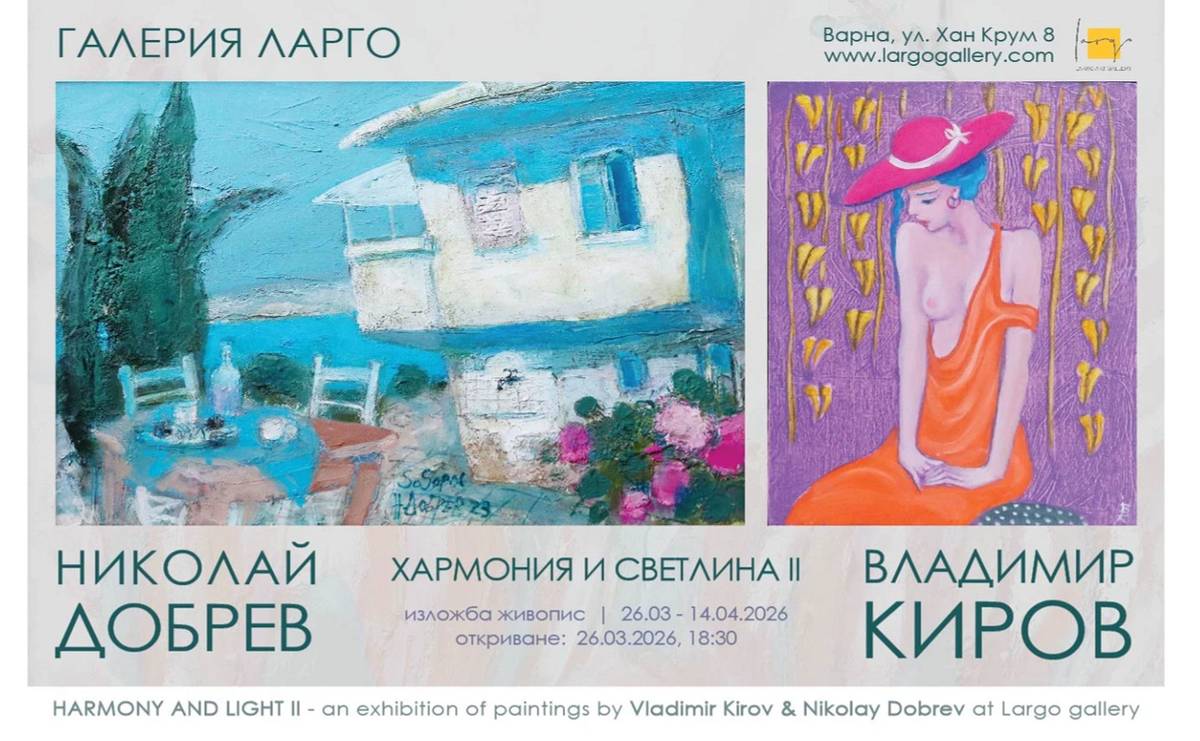 На 26 март 2026 година от 18:30 часа галерия „Ларго” ни кани на откриването на сборната изложба живопис на Владимир Киров и Николай Добрев, озаглавена „Хармония и светлина II”. Двама ловешки художници, свързани от приятелство и общ път, се завръщат в пространството на галерията години след първата си съвместна изложба “Хармония и светлина” през 2014 година. Времето между двете изложби може да се тълкува не като пауза, а като надграждане - нов поглед, преоткрита тишина, натрупан опит. Днес хармонията и светлината се появяват отново - сякаш ехо, което е намерило своя нов отглас.