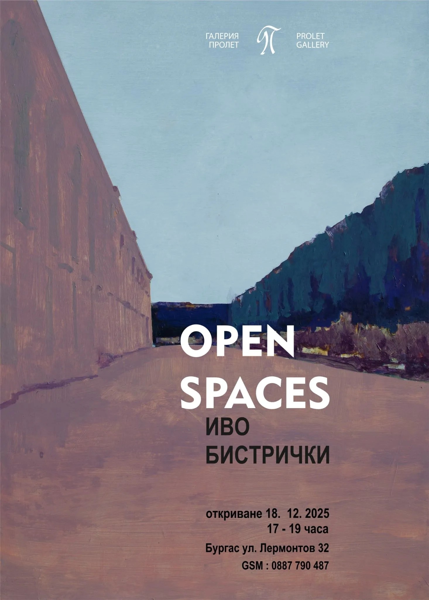 Галерия „Пролет“ представя „OPEN SPACES”, изложба - живопис на Иво Бистрички. Тя ще бъде открита на 18 декември /четвъртък/ от 17.00 часа и може да бъде видяна до 23 януари 2026 година. В експозицията са показани десет живописни платна.