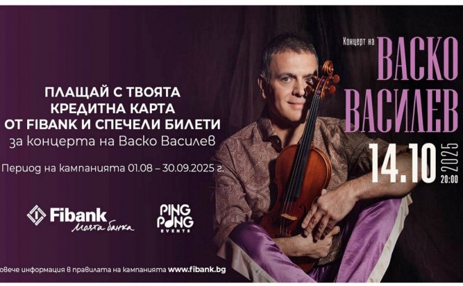 Fibank (Първа инвестиционна банка) стартира промоционална кампания, която ще продължи до 30 септември 2025 г. включително и предоставя шанс за 50 двойни покани за концерта на Васко Василев в град София.