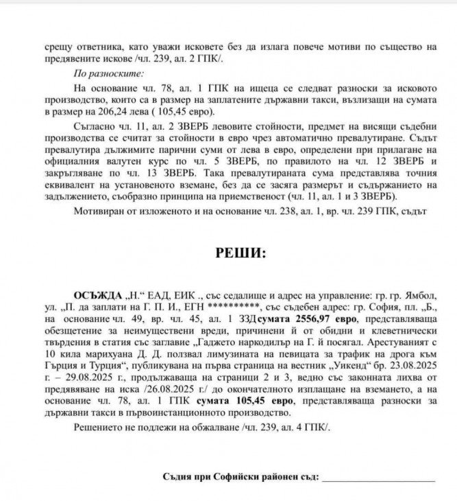 Съдът отреди издателят да заплати над 2500 евро обезщетение с лихвите и разноските по делото на Глория за клевета