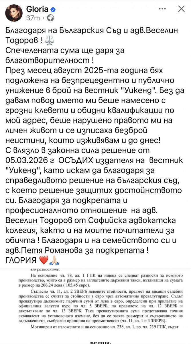 Самата Глория благодари на съдебната система и адвоката си Веселин Тодоров, които й помогнаха в битката с жълтата преса, и публикува съдебното решение.