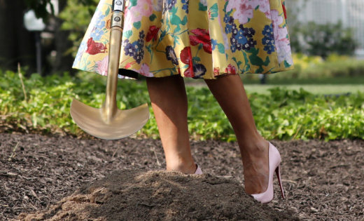 Наблюдателните журналисти забелязаха, че първата „градинарка“ копае яма облечена в цветната пола на модната къща на „Валентино“ на стойност около четири хиляди долара и в меки розови обувки на „Лубутен“, чиито високи токчета се зариваха в пръстта.