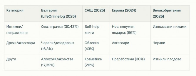Българите избягват книги (10%), тъй като предпочитат да ги избират сами, подобно на глобалния тренд за персонализация. В САЩ и UK дрехите и домакински предмети водят класацията заради грешни размери, докато в България интимните джунджурии шокират.