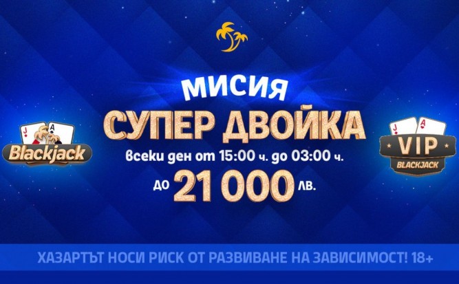 Мисия „Супер двойка“ дава шанс на потребителите да спечелят 21 000 лв. под формата на безплатни чипове, които могат да се използват като безплатен залог в Palms Live. И това се случва докато просто играят любимата си игра Blackjack.