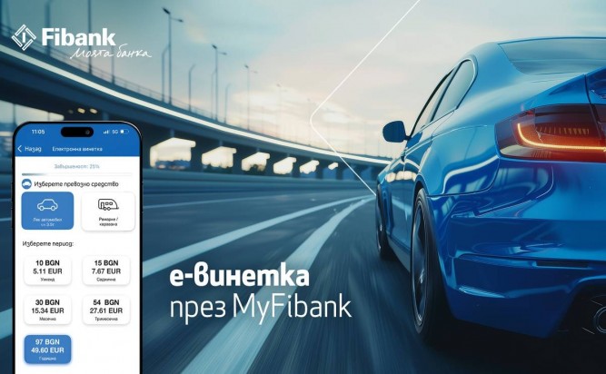 Клиентите на Fibank (Първа инвестиционна банка) могат бързо, лесно и сигурно да закупят електронна винетка директно през мобилното приложение My Fibank или уеб платформата на банката. Стойността й вече е приравнена в евро по официалния курс от 1.95583 лева за 1 евро. Процесът е бърз и интуитивен, отнема по-малко от минута и не включва допълнителни такси. Закупената винетка е активна веднага след успешно плащане.