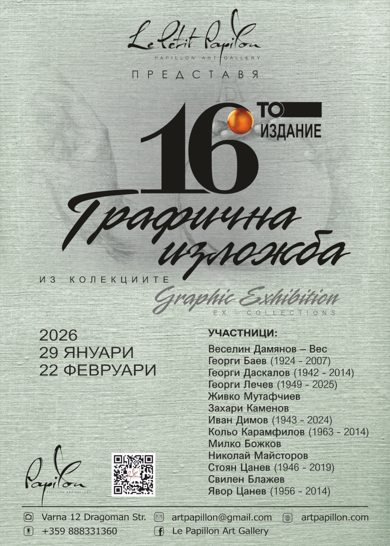 По традиция, всяка година през януари дните в изложбения календар на Арт Галерия Папийон са посветени на почитта към графичното изкуство, с което много български творци засвидетелстват таланта си на международната сцена. Фокусът на селекцията на това 16-то издание „Из колекциите“ от 29-ти януари до 22-ри февруари 2026 е поставен върху утвърдени имена в българското изкуство, отдавна надскочили границите на родината, чийто творби са част от престижни частни колекции в България и в чужбина, предлагани на международни аукциони и влизащи в експозициите на големи европейки галерии.