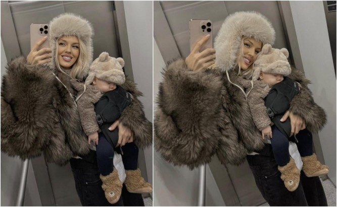 Както сега е модерно, русокосото мамче се е „match“-нала със сина си и двамата са с сиви пухени шапки и връхни дрехи в същия цвят. Изглежда малчуганът не е дочакал звездната си фотосесия и сладко е заспал в кенгуруто върху гърдите на мама.