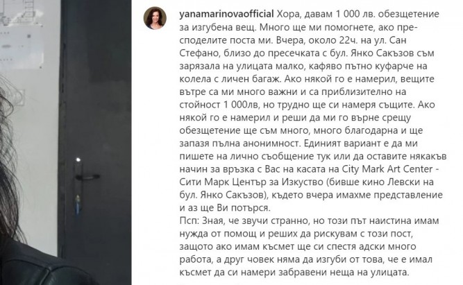 "Ако някой го е намерил и реши да ми го върне срещу обезщетение ще съм много, много благодарна и ще запазя пълна анонимност. Единият вариант е да ми пишете на лично съобщение тук или да оставите някакъв начин за връзка с Вас на касата на City Mark Art Center - Сити Марк Център за Изкуство (бивше кино Левски на бул. Янко Сакъзов), където вчера имахме представление и аз ще Ви потърся".