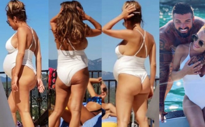 Там бяха публикувани папарашки кадри доказващи, че обезформянето на фигурата, което е типично за почти всички бъдещи майки, е застигнало и златната плеймейтка, но очевидно тя се срамува от това и се опитва да го прикрие.