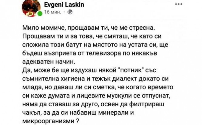 А за нещастие на Габриела Цонева от „Ергенът“, брат Ласкин е решил да се фокусира точно върху нея и нейното колоритно излъчване. Преди дни Евгени буквално попиля в мрежата една от колоритните участнички в “Ергенът”, и за нейно добро се надяваме да не е попаднала на коментара му, пише Марица.