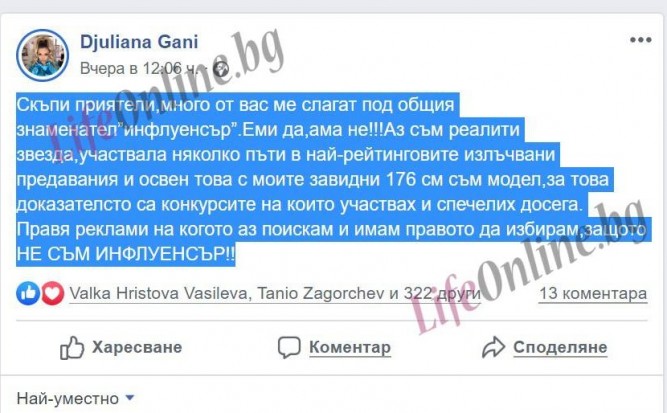 „Скъпи приятели, много от вас ме слагат под общия знаменател”инфлуенсър”.Еми да, ама не!!! Аз съм реалити звезда, участвала няколко пъти в най-рейтинговите излъчвани предавания и освен това с моите завидни 176 см съм модел, за това доказателсто са конкурсите на които участвах и спечелих досега.