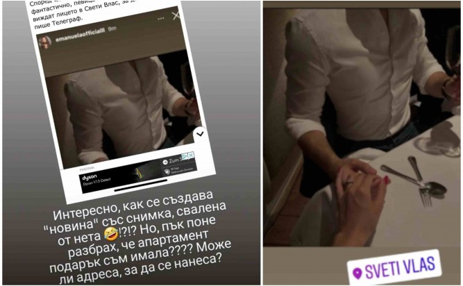 „Просто си харесах тази снимка в интернет и си я сложих на стори и някой видя „новина“. А за апартамента не знаех, но ако „журналистите“ са толкова осведомени да ми дават ключа и нотариалния акт.“, заяви пред репортер на LifeOnline.bg изпълнителката с изумрудени очи.