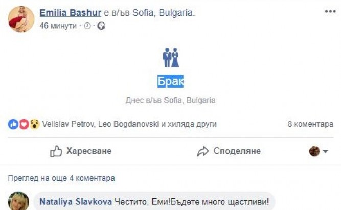 Жорж и Емилия побързаха да сменят семейния си статут във Фейсбук съответно на "Женен" и "Омъжена", като певицата промени и фамилията си на Башур.