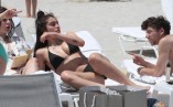Младата жена се пече спокойно на плаж с гаджето си и приятели