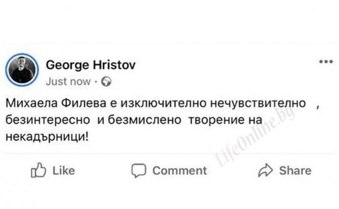 „Михаела Филева е изключително нечувствително, безинтересно и безсмислено творение на некадърници“, написа Христов.
