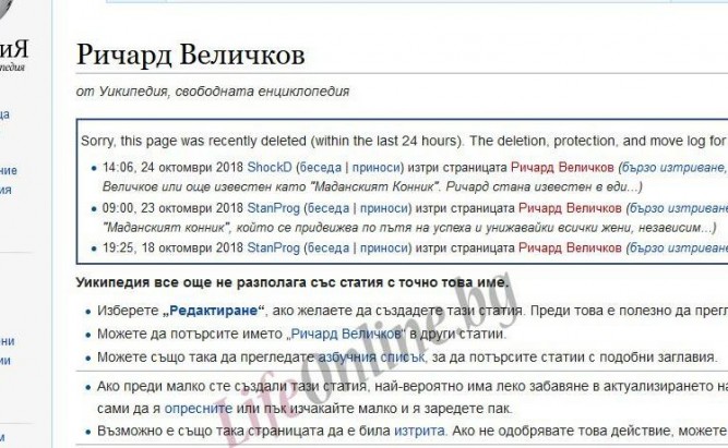 Зевзеци се опитаха да създадат профил на Ричард Величков от Мадан в свободната интернет енциклопедия – Уикипедия, видя репортер на LifeOnline.bg.
