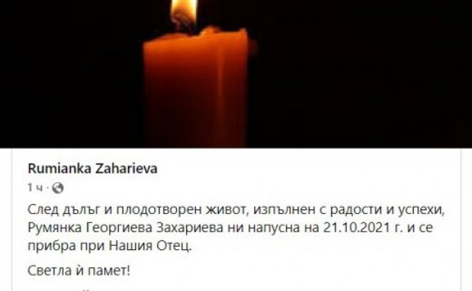 "След дълъг и плодотворен живот, изпълнен с радости и успехи, Румянка Георгиева Захариева ни напусна на 21.10.2021 г. и се прибра при Нашия Отец. Светла ѝ памет! От Семейството", гласи краткото съобщение във Фейсбук профил на неговата майка, което той е споделил.