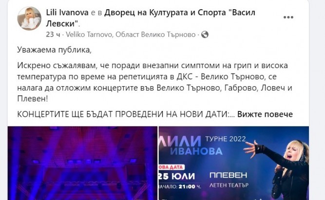 „Искрено съжалявам, че поради внезапни симптоми на грип и висока температура по време на репетицията в ДКС - Велико Търново, се налага да отложим концертите във Велико Търново, Габрово, Ловеч и Плевен!“, и благодари за разбирането на своята вярна публика.