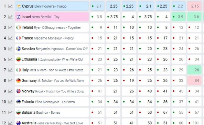 До началото на полуфиналите за победител бе спрягана изпълнителката от Израел Нета Барзилай, след това обаче тя отпадна до третото място, като за победител според букмейкърите е сочена представителката на Кипър - Елени Фурейра, констатира репортер на LifeOnline.bg.