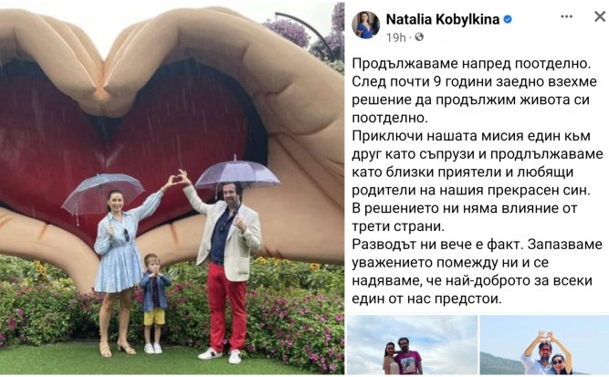 „Продължаваме напред поотделно. След почти 9 години заедно взехме решение да продължим живота си поотделно. Приключи нашата мисия един към друг като съпрузи и продължаваме като близки приятели и любящи родители на нашия прекрасен син. Разводът ни вече е факт. Запазваме уважението помежду ни и се надяваме, че най-доброто за всеки един от нас предстои", анонсира краха на брака си тя във Фейсбук.