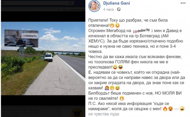 Винилов билборд с моделката е бил умело свален от рекламно съоръжение по магистрала Хемус в района на Ботевград.
