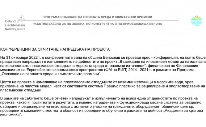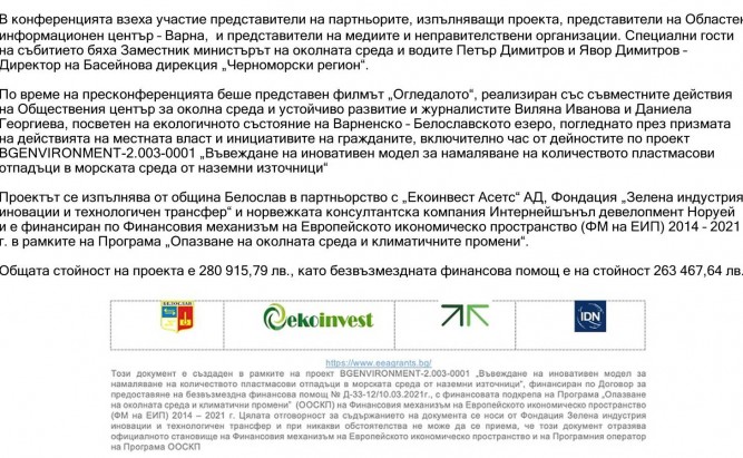 Проект BGENVIRONMENT-2.003-0001 „Въвеждане на иновативен модел за намаляване на количеството пластмасови отпадъци в морската среда от наземни източници“