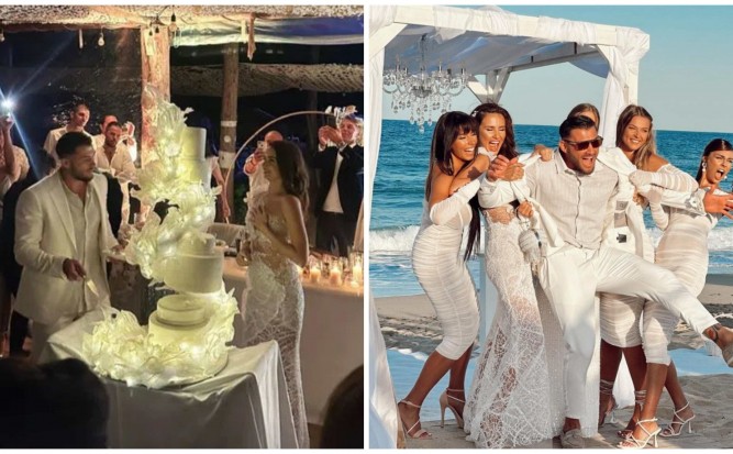 Двамата се врекоха във вечна вярност на изнесен на морския бряг ритуал, а всички гости бяха в бяло по желание на булката, която бе избрала дантелена рокля с воал.