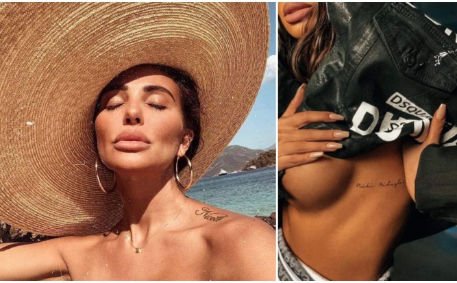 Между двете любовни татуировки тя изписа името на дъщеря си Никол на ключицата си.