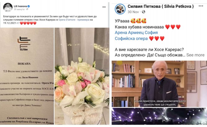 „Благодаря за поканата и уважението! За мен ще бъде чест и удоволствие да слушам големия оперен глас Хосе Карерас в Opera D'amore - премиера на 19.12.2021 г.!“ е публикацията в последния пост в социалните мрежи на естрадната дива.