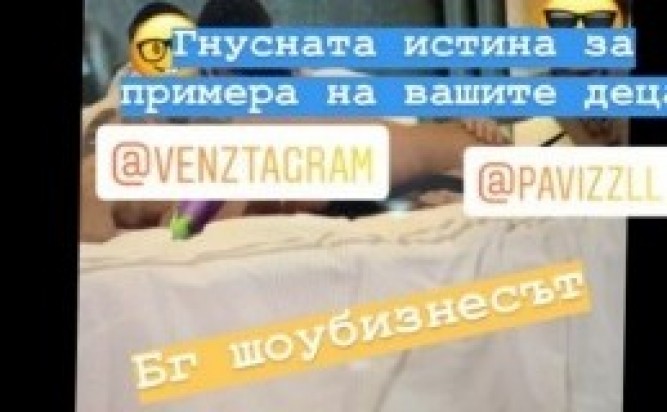 Фотосът е прикрит с надпис „Гнусната истина за примера на вашите деца“, но ясно се вижда, че на кадъра са двамата изпълнители с гола мадама между тях в откровено горещи пози.
