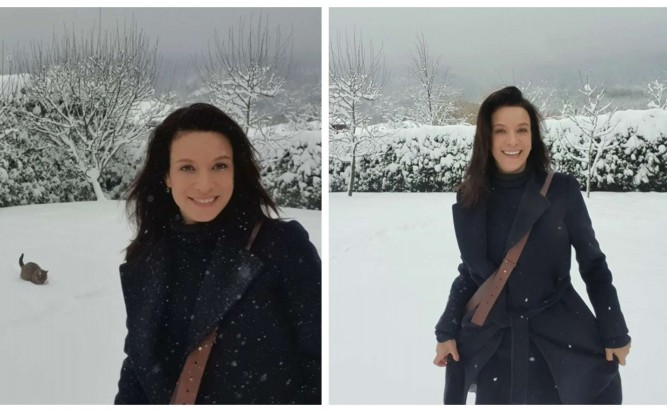 Актрисата стои ухилена под снежинките, а на двора зад нея припка игривата й котка.