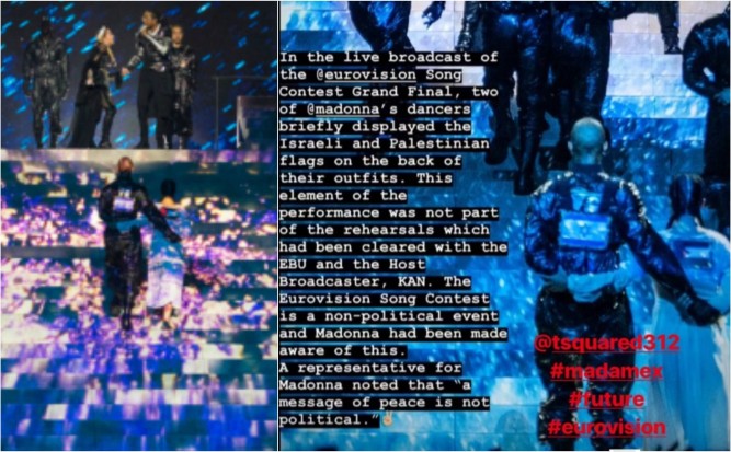 „Този елемент от изпълнението не беше част от репетициите, което е известно. Песенният конкурс „Евровизия“ е неполитическо събитие и Мадона е запозната с това“, подчертават организаторите.