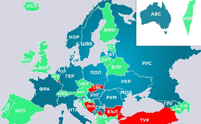 зелено - Може да гласува за България на полуфинал - 8 май и на финал на 12 майГЛАСУВАНЕ В ПЪРВИ ПОЛУФИНАЛ НА 8 МАЙ 2018