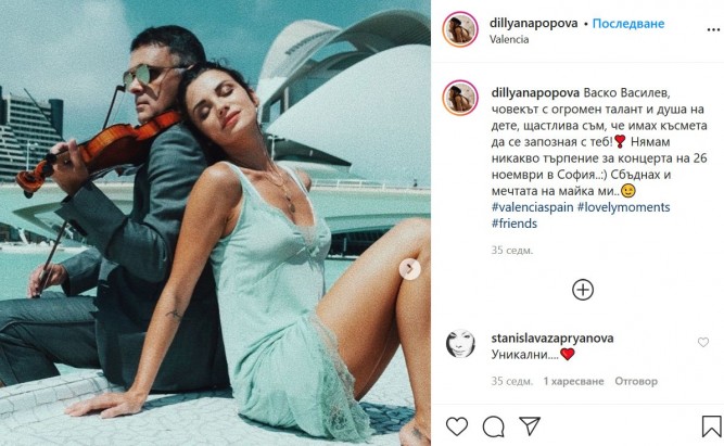 "Васко Василев, човекът с огромен талант и душа на дете, щастлива съм, че имах късмета да се запозная с теб! Нямам никакво търпение за концерта на 26 ноември в София...Сбъднах и мечтата на майка ми", написа тогава под снимки с цигуларя Диляна.