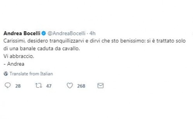 Прочутият тенор Андреа Бочели е пострадал след като падане от кон, съобщи агенция АНСА, цитирана от БГНЕС. Инцидентът е станал в имението му в Лаятико край Пиза. За оказване на медицинска помощ освен линейка е пристигнал и хеликоптер. 59-годишният Бочели, който ослепява на 12-годишна възраст заради заболяване от глаукома, е бил откаран в болница в Пиза. Певецът успокои почитателите си, че се чувства добре и очаква тази вечер да бъде изписан.