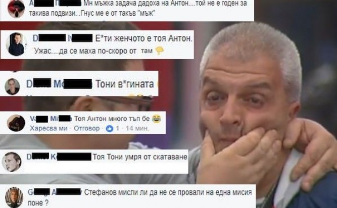 Противоречивото представяне на "голямата уста" Антон Стефанов в тазгодишния сезон на Вип Брадър доведе до лавина от хапливи коментари в мрежата по адрес на журналиста, видя с очите си репортер на LifeOnline.bg. Абсолютният му провал във всички мисии, склонността да се крие зад крехките гърбове на жените в Къщата и тоталната му пасивност пред всички мъже навлякоха на Тони безкрайна канонада от хули и хронично недолюбване както от страна на останалите съквартиранти, така и от зрителите на предаването. Неспособността на Стефанов да отстоява мнение и да се конфронтира адекватно за да защити малкото си останала чест в Къщата го превърнаха в абсолютен аутсайдер, а капризниченето му по време на мисии успя да изкара от равновесие дори и спокойният Алфредо. Страдалческата поза, сълзите и сополите предизвикват едновременно и смях, и раздразнение. Драгият зрител в никакъв случай не остава равнодушен и ежедневно залива страницата на предаването с гаври и подигравки по адрес на журналиста. "Лигльо", "Мъж без мъжественост", "скатавка" и купища епитети на тема сексуална ориентация се изсипват ежедневно из мрежата по адрес на Антон, част от които от благоприличие ще Ви спестим.